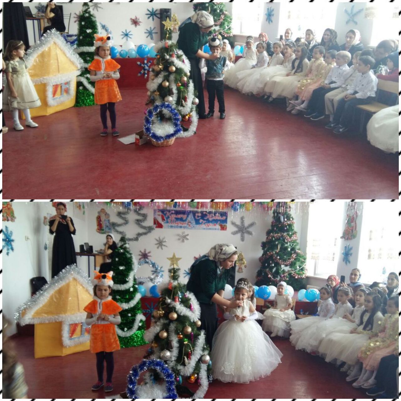 Дети поставили сценку посвященную празднику, читали стихи, пели новгодние песни и поздравили воспитателей. Все радовались снегу.